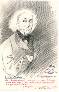 (1859-1952). Dessin original à la pierre noire signé avec légende autographe à l’encre rouge, Victor Cousin ; 19,5 x 30 cm. Portrait du philosophe Victor Cousin, signé « F. Bac témoin auriculaire ». Bac cite en légende un mot d’Hortense Howland (1835-1920) : « Quel homme multiple ! Il croyait avoir affronté le Danger mortel avec Louise Colet [qui avait poignardé Alphonse Karr]. Mais je suis là pour dire qu’il n’a pas connu la Femme… » On joint la photographie originale de Victor Cousin ayant servi de modèle à Ferdinand Bac (tirage sur papier albuminé, 18,4 x 24,3 cm, cliché Pierre-Louis Pierson et Léopold-Ernest Meyer, avec retouche manuelle).