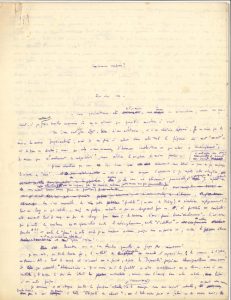 Deux manuscrits autographes signés, Cauchemars aseptisés ?, [1949-1952] ; 5 pages et demie in-4 et 7 pages et quart in-4. Deux versions d’un texte polémique, longue lettre ouverte en réaction à l’article Lettres d’un Solitaire sur le sujet du concert par Luc-André Marcel dans la revue Polyphonie (5e cahier, Le Concert, 1949), fustigeant entre autres des écrits et œuvres musicales de Pierre Boulez. Les manuscrits sont rédigés d’une petite écriture à l’encre bleu nuit, et présentent deux versions successives du texte, la première abondamment raturée et corrigée, la seconde avec de nouvelles corrections. La seconde version a été publiée dans la Revue musicale en 1952 sous le titre Éventuellement…, et recueillie dans Relevés d’apprenti (Seuil, 1966). « Le don quichottisme est, si l’on veut, une forme de rédemption ; encore ne faudrait-il pas constamment voir terribles ennemis où ne se trouvent que paisibles moulins à vent. Je viens de lire certaines lettres qui sont bien, en effet, d’un solitaire, et d’un solitaire déprimé. Je ne suis pas le moins du monde psychanalyste ; mais je me plais à relever dans ce texte la fréquence du mot “mort” – et de tous ses dérivés ; ainsi, du reste, vous excuserez l’humour involontaire – que celui de “dodécaphonie” ; de même que le “sentiment de culpabilité” sans oublier le complexe de même farine. Je crois volontiers l’épistolier en question dans un dénuement assez total – pour ne pas employer le vocable de “crise”… –vis-à-vis des moyens d’expression. […] Car c’est merveille de voir sa “frivolité” (au sens de Valéry) se réverbérer négligemment (?) tout au long de cet article, sauf en quelques endroits – qui me chagrinent fort – où postulats et combativité arrivent tout à coup au pas de charge pour venir à la rescousse d’une pensée… disons réactionnaire. C’est ainsi que je note la constance des agressivités contre le dodécaphonisme, contre l’“intellect” – à la Benda ?? – contre la “forme” de ce siècle – en constant devenir, “quoiqu’on dise” – contre le silence. […] Je reconnais en toute bonne foi, l’inutilité du concert d’aujourd’hui, la carence de l’État, des Beaux-Arts. Tout le monde est d’accord sur ce point depuis les “progressistes” jusqu’aux chroniquailleurs “musicaux” et, par surcroit, hebdomadaires. Je ne crois pas à la facilité d’un développement sur ce thème, mais à son inutilité ; le moyen le plus sûr étant la mitraillette, comme il est écrit dans ces lettres, hélas ! à un autre propos. […] Je m’excuse d’être, à présent, obligé de parler de moi : mais on incrimine un article que j’avais écrit sur le rythme et on l’incrimine, je crois, sans l’avoir lu de très près. Je laisse à l’auteur de ces lettres toute liberté de trouver que ma musique sonne “morne, confus et dévertébré”. […] Mais passons sur cela : où je n’admets même pas la discussion, c’est lorsqu’il affirme que je n’ai pas “semblé” – cette fois le doute (?) y est, je le reconnais – “me soucier du résultat sonore de mes superpositions”. S’il avait lu le texte plus attentivement – le texte musical aussi bien que le texte explicatif – l’épistolier se serait sans doute aperçu que l’article était en partie centré sur la coordination ou l’antagonisme par lesquels on peut agréger les schèmes rythmiques à la répartition de l’espace sonore »… Etc. On joint le tapuscrit.