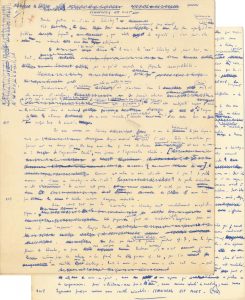 Manuscrit autographe, Schönberg est mort, [1952] ; 5 pages petit in-4. Brouillon très corrigé d’un important article sur Arnold Schönberg publié dans The Score en février 1952, et recueilli dans Relevés d’apprenti, Seuil, 1966), marquant son émancipation du père du dodécaphonisme. Le manuscrit, rédigé d’une écriture microscopique au stylo bille bleu, abondamment raturé et corrigé, porte en marge le compte du nombre de mots. « Prendre position quant à Schönberg ? C’est certainement une nécessité des plus urgentes ; c’est, néanmoins, un problème fuyant, qui rebute la sagacité ; c’est, peut-être, une recherche sans issue satisfaisante. [...] Car nous assistons avec Schönberg à un des bouleversements les plus importants que le langage musical ait été appelé à subir. Certes, le matériau proprement dit ne change pas : les douze demi-tons ; mais la structure organisant ce matériau est mise en cause : de l’organisation tonale nous passons à l’organisation sérielle. Comment cette notion de série est-elle venue à jour ? De quelles déductions est-elle le résultat ? En suivant cette genèse, il semble que nous serons bien près de déceler certaines divergences irréductibles. Disons, avant tout, que les découvertes de Schönberg sont essentiellement morphologiques »... Boulez étudie la discipline introduite par Schönberg sur l’emploi des intervalles et du matériau sonore, et analyse l’évolution de son œuvre depuis les Cinq Pièces pour piano de l’opus 23, « inaugural manifeste de l’écriture sérielle », qui marque « une nouvelle organisation du monde sonore » et arrivera à « une schématisation consciente » dans les Variations pour orchestre op. 31. Mais Boulez se montre critique à l’égard de sa tendance à l’« ultrathématisation » : « la confusion, dans les œuvres sérielles de Schönberg, entre le thème et la série est suffisamment explicite de son impuissance à entrevoir l’univers sonore qu’on appelle à proprement parler la série. Le dodécaphonisme ne consiste alors qu’en une loi rigoureuse pour contrôler l’écriture chromatique ; à ne jouer que le rôle d’un instrument régulateur, le phénomène sériel est, pour ainsi dire, passé inaperçu de Schönberg »… Et Boulez continue son analyse critique, pour affirmer : « Si l’échec Schönberg existe, ce n’est pas en l’escamotant que l’on entreprendra de trouver une solution valable au problème posé par l’épiphanie d’un langage contemporain ». Pour lui, il faudrait rechercher avec un Webern « l’évidence sonore en s’essayant à un engendrement de la structure à partir du matériau. Peut-être pourrait-on élargir le domaine sériel à des intervalles autres que le demi-ton : micro-distances, intervalles irréguliers, sons complexes. Peut-être pourrait-on généraliser le principe de la série aux quatre composantes sonores : hauteur, durée, intensité et attaque, timbre »… Pour Boulez, Schönberg n’est pas une sorte de Moïse avec les Tables de la Loi, et il conclut : « Schönberg est mort ». On joint le tapuscrit ; et une plaquette de présentation du disque L’œuvre pour piano de Schoenberg (avec texte de Boulez).
