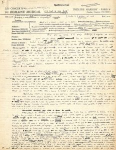Manuscrit autographe, “à la limite du pays fertile”, [1955] ; 4 pages et demie in-4 sur papier à en-tête Les Concerts du Domaine musical, Théâtre Marigny. Sur la place de l’électroacoustique dans la musique. Article paru dans le premier numéro de la revue allemande Die Reihe en 1955 (recueilli dans Relevés d’apprenti, Seuil, 1966). Le manuscrit, rédigé d’une minuscule écriture à l’encre noire et rouge, avec de nombreuses ratures et corrections, présente quelques variantes avec le texte publié. Le titre est une citation de Paul Klee, peintre que Boulez admirait. « Placé face au monde de la musique électronique, le compositeur est décontenancé par les obstacles imprévus dans un domaine qu’il estime pourtant le seul acceptable s’il désire réaliser une pensée musicale dont les compétences dépassent les moyens instrumentaux. Il serait vain de parler des échecs que lui propose la prise de contact avec les appareils d’un studio : ces difficultés peuvent se surmonter si l’on sait à peu près apprivoiser l’univers nouveau où l’on a l’intention de s’exprimer. Le réel gouffre de la rencontre avec les moyens électroniques, c’est que bascule toute la conception sonore à laquelle l’avaient habitué son éducation, sa propre expérience ; surgit un renversement total des limites imposées au compositeur, plus qu’un renversement, une sorte de cliché négatif : tout ce qui était limite devient illimité, tout ce que l’on croyait impondérable devient à son tour un mythe après être longtemps demeurée à l’état de hantise : plus on veut réduire l’erreur, moins celle-ci se laisse circonscrire. On est loin de l’enchantement que l’on s’apprêtait à découvrir, enchantement au pouvoir du compositeur qui allait enfin se libérer de toutes les entraves accumulées par des siècles résiduels ! »... Etc.