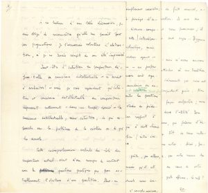 Manuscrit autographe signé « P.B. » ; 11 pages in-8. Discussion sur le rôle du compositeur actuel. Le manuscrit, rédigé d’une petite écriture lisible à l’encre noire, comporte quelques ratures et corrections au stylo vert ou rouge. « À la lecture d’une telle discussion, je suis obligé de reconnaître qu’elle me paraît fort peu pragmatique. Je l’accuserais volontiers d’abstraction, si je ne tenais compte de son côté improvisé. [...] Cette incompréhension verbale du rôle du compositeur actuel vient d’un manque de contact avec les questions pratiques que pose actuellement l’écriture d’une partition. [...] le malentendu vient de ce qu’on n’a pas défini avec suffisamment de précision ce qu’est la “série’”, ce que sont les possibilités “sérielles” ; à partir de cette ellipse, chacun se laisse le loisir d’une idée à son propre usage, ce qui ne contribue pas à clarifier le dialogue […] pour instaurer un dialogue de sourds, où le malentendu est normal et inévitable. […] Dans cette réponse, je constate une absence totale de précision dans les mots, une abstention non moins totale dans les définitions, d’où il résulte une confusion sans pareille dans le raisonnement. Une vague machine intellectuelle broie à vide des termes sans signification concrète. Je suis personnellement mis en cause, peu importe ! [...] Je reste béat devant une pensée aussi survoltée. La caricature d’un certain “humanisme” est désinvolte vis-à-vis du concret à un point que les déductions belliqueuses de Picrochole ou les méthodes financières d’Ubu atteignent difficilement. [...] Aussi m’est-il impossible de répondre à des objections qui ne sont pas fondées ». Ainsi Boulez poursuit-il en donnant des définitions de la « série », « musique ponctuelle »… « La confusion entre le déroulement d’une série – ou d’un ensemble de séries additionnées – et son (ou leur) potentiel organisateur est à la base de toutes ces discussions effarantes d’inadéquation avec la réalité musicale. C’est précisément vers une rationalité sensible que tend la composition actuelle »… Et après avoir rejeté le rattachement à une tradition, Boulez conclut, en s’adressant aux « jeunes musiciens, ne vous préoccupez pas outre mesure des dilemmes qui ne s’érigent pas au cœur de votre création. Allez à l’important : un geste efficace »...