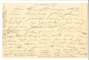 (1861-1929) sculpteur. L.A.S., 19 mars 1889, à Roger Milès ; 1 page oblong in-8 (carte postale) avec adresse au verso (trace de pli). Le critique lui ferait grand plaisir s’il pouvait venir voir son travail : « ça marche, pas mal, je suis seulement un peu en retard. Dites je vous prie bien des choses aux Messieurs Lanta pour mon père et pour moi que le fils vienne avec vous si cela lui est possible ; je vous dirai aussi une curieuse histoire, mais vous savez déjà que certains écrivassiers valent si peu et la plupart des éditeurs encore moins »... Il ajoute : « Je remets ma statue aux mouleurs le 26 mars »...