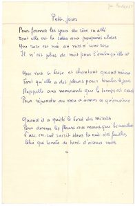 (1897-1950). Poème autographe, Petit-jour ; 1 page in-8 sur une carte bristol lignée. Belle pièce de trois quatrains : « Pour fermer les yeux du rêve en allé Dont elle est la sœur aux paupières closes Une rose est née au nid d’une rose Il n’est plus de nuit pour l’ombre qu’elle est »...