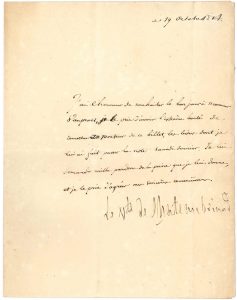 (1768-1848). L.S. « Le Vte de Chateaubriand », 19 octobre 1814, à Joseph Van Praet, « Conservateur de la bibliothèque du Roi » ; 1 page petit in-4, adresse. Emprunt de livres à la Bibliothèque royale. Il souhaite le bon jour à M. Van Praet, et « le prie d’avoir l’extrême bonté de remettre au porteur de ce billet, les livres dont je lui ai fait passer la note samedi dernier »... On joint une P.A.S. de Joseph Van Praet, 16 mai 1810 (1 page in-4), recevant pour la Bibliothèque impériale, de M. Molini de Florence, « un exemplaire de l’ouvrage intitulé : Opere di scultura e di plastica di Antonio Canova, descritte da Isabella Albrizzi »…