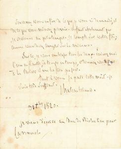 L.A.S., 31 décembre 1820, à Jacques-Joseph de Corbière ; 2 pages in‑fol., fragment de l’enveloppe montée en tête de lettre (salissures, fentes aux plis réparées). Très importante lettre politique le soir de son départ pour Berlin, où il venait d’être nommé ambassadeur. [Les ultras viennent de remporter les élections législatives de novembre 1820, et Richelieu, à la tête du gouvernement, se voit contraint de les y faire entrer. Mais Louis XVIII et les ministres en place ne veulent pas de Chateaubriand, qui est écarté et envoyé à Berlin. Chateaubriand réussit cependant à placer au gouvernement deux pions, les ultras Villèle et Corbière, qui est nommé ministre d’État et président du Conseil royal de l’Instruction publique.] « Voici, mon brave compatriote, mes dernières volontés dont je vous rends, vous et notre ami Villèle, les exécuteurs. Trois réparations immédiates. L’une au militaire, l’autre à la justice, la troisième dans l’administration à savoir : Cannuel [le général Simon Canuel], Agier et Trouvé : Cannuel surtout ; c’est le moyen de vous attacher tous les royalistes, et de faire taire toutes les oppositions de notre bord. Soigner les journaux ; faire écrire dans votre sens, et diriger l’opinion monarchique. Malheureusement je vous manquerai beaucoup pour cela : mais enfin ne faut-il pas renoncer à ce travail de toute nécessité. Vous lier étroitement avec Bouville et Bertin : ces deux hommes rendront votre partie certaine : devenez inséparables. Prenez garde à la décomposition de l’armée. Le salut est là. Souvenez vous enfin de ce que je vous ai demandé, et de ce que vous m’avez promis. Il faut absolument que je revienne au printemps. Je compte sur votre foi ; comme vous devez compter sur la mienne »... Il les embrasse tous les deux, et prie de lui écrire régulièrement en faisant passer les lettres par La Borie. Il part cette nuit, bien que très souffrant… Correspondance générale, t. III, p. 293.