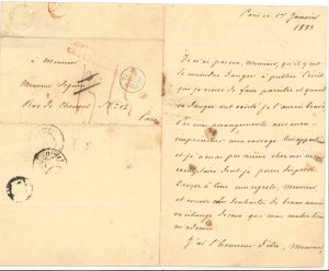 L.S., Paris 1er janvier 1833, à M. Seguin ; 1 page et demie in-8 (dictée à son secrétaire Hyacinthe Pilorge), adresse avec marque postale Bureau de la Chambre des Pairs (quelques rousseurs). À propos de son Mémoire sur la captivité de Mme la duchesse de Berry. Il n’a pas cru « qu’il y eut le moindre danger à publier l’écrit que je viens de faire paroitre et quand ce danger eut existé je l’aurois bravé. Par mes arrangements avec mon imprimeur mon ouvrage lui appartient et je n’en ai pas même chez moi un seul exemplaire dont je pusse disposer »...