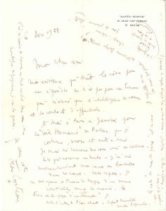 L.A.S., St-Jean Cap-Ferrat 6 décembre 1958, à un ami ; 1 page in-4 à en-tête de “Santo-Sospir”.« Mon existence qui serait le rêve pour un égoïste ne l’est pas pour un homme qui n’estime que l’intelligence de cœur et les contacts d’affection. Je serai à Paris en janvier pour la Voix Humaine de Poulenc que je costume, décore et mets en scène ». Il n’a pas de texte : « j’ai mis momentanément mon encre en bouteille dans la cave. Elle repose. Je me suis aperçu en France du danger d’une œuvre considérable comme la mienne. La France est le pays “d’une seule œuvre”. Je reste l’auteur de Plain-chant, Enfants terribles, Machine infernale. Le reste “on me le passe” et encore. Le Français se repose l’esprit dans un titre célèbre : Adolphe, La Pesse de Clèves, Le Rouge et le Noir, etc. […] S’il m’arrive de trouver un texte inédit dans ma montagne de paperasses, je vous le garde »...