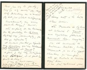 (1836-1891). L.A.S. « Léo D. », [Bruxelles] Dimanche [5 février 1888, à son ami et éditeur Henri Heugel] ; 4 pages in-8 (petit deuil).La première de Sylvia est retardée à jeudi, avec répétition générale mercredi soir. « J’ai été enchanté de Madame Melba ; malheureusement je ne l’ai fait chanter qu’une fois. Elle est malade de nouveau depuis hier. Je me suis exténué pour ce ballet où il y avait bien des choses à régler encore. Le chorégraphe et l’orchestre vont bien, mais c’est la mise en scène et le matériel qui laissaient encore à désirer après la répétition d’hier soir. On pouvait reculer, à cause de la maladie de Mme Melba qui désorganise les spectacles. [...] Aujourd’hui exécution assez froide d’ève avec Mme Caron – qui, elle, a été très accueillie. Massenet n’est pas venu ; je crois qu’il boude un peu ces messieurs à cause du Cid »... Il demande des impressions de La Dame de Montsoreau [de Gaston Salvayre], et se plaint des difficultés à organiser « mes petites femmes du Roi l’a dit. Je ne puis être à tout, et je commence à être exténué. J’ai surtout horreur d’écrire ! Et je ne puis en trouver le temps ! »...