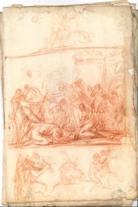 34 feuilles, XVIIIe siècle ; in-fol. (mouillures, salissures, bords effrangés). Esquisses à la mine de plomb, à la sanguine, au lavis : figures antiques ou mythologiques, scènes d’intérieur, détails architecturaux. On joint un dessin à l’encre de Chine, signé et daté « Ad. Gir. 87 » par Adolphe Giraldon, peut-être un projet de frontispice ou de page décorée de livre, avec médaillon de Melpomène (in-fol.).