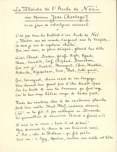 (1872-1960). Poème autographe signé, La Plainte de l’Arche de Noé vers Monsieur Jean Chantagut en ces jours de cataclysme universel, 25 novembre 1932 ; 2 pages in-4. Jolie pièce calligraphiée de 10 quatrains, pour solliciter la souscription à son prochain recueil de vers, L’Arche de Noé (Typographie Armand Jules Klein, 1934). « C’est par tous les hublots d’une Arche de Noé – Ponton aux ais criards, tanguant sous la tempête, – Et dont je suis le capitaine éberlué »...