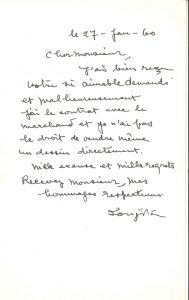 (1886-1968). L.A.S., 27 janvier 1960 ; ¾ page in-8. « J’ai bien reçu votre si aimable demande et malheureusement j’ai le contrat avec le marchand et je n’ai pas le droit de vendre même un dessin directement »...