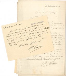 (1824-1904) peintre. 4 L.A.S., 65, boulevard de Clichy 1884-1900 et s.d. ; 1 page in-8 chaque à son adresse. 5 juin 1884, à un collègue, président de la commission des secours [de la Société des Artistes peintres, sculpteurs et graveurs]. Âgé de 60 ans, membre de la Société depuis plus de trente ans, il a droit à la pension de 300 francs. « Dois-je la réclamer pour la verser à la Caisse des secours ou bien la laisser à la Caisse Générale de la Société ? »... 11 octobre 1885. Envoi d’un spécimen de son écriture, « très heureux que mon nom figure dans votre collection d’autographes »... 8 avril 1900, remerciant un ami pour un livre dédicacé : « Je le lirai avec d’autant plus d’intérêt qu’il est de vous d’abord, ensuite, que j’ai été mêlé à ces événements tout jeune encore, et que j’en ai gardé une impression qui ne s’effacera jamais »... S.d., à un confrère. Il note le dîner à l’hôtel Cluny le 13 avril. « Vous pouvez compter sur moi, à moins que je ne sois parti pour la Hollande où je suis obligé d’aller faire des études de tulipes pour un tableau en voie d’exécution »...
