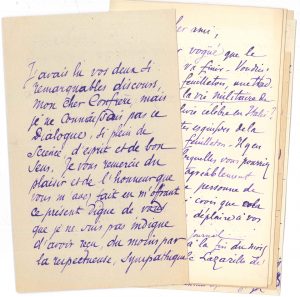 (1842-1905). 6 L.A.S., la plupart à Georges Patinot, directeur du Journal des Débats ; 8 pages in-8 à l’encre violette. Il remercie un confrère : « J’avais lu vos deux remarquables discours, mon cher confrère, mais je ne connaissais pas ce Dialogue, si plein de science, d’esprit, et de bon sens »… Mardi [1885 ?]. Ayant appris par Vogüé que le Dostoïevski va finir de paraitre en feuilleton dans le Journal des débats, il propose pour le remplacer « une traduction des Scènes de la vie militaire de De Amicis, livre célèbre en Italie. Ce sont de courtes esquisses de la longueur d’un feuilleton », très agréablement traduites et qui devraient plaire aux lecteurs d’été. Il va porter au journal « une étude sur le Lazarille de Tormès. J’espère que vous voudrez bien lui faire un place dans les Variétés »… Lundi soir [1887]. Il va faire un article sur Le Scorpion de Prévost, qu’il lui portera avec celui sur le Meuble de Bonnaffé [Le Meuble en France au XVIe siècle]... Mardi. « Tu te plaignais de ne jamais rien recevoir de moi pour le Journal. Voici un petit Au jour le jour que je te prie de faire passer […]. Si ça te va, je pourrai en faire de temps à autre »… 20 août 1888. Il vient d’être nommé officier de la Légion d’Honneur par le Ministre des Affaires Étrangères : « Comme, à cause de ma qualité d’Espagnol, le décret ne doit pas paraître à l’Officiel, et que l’honneur d’avoir collaboré aux Débats n’est pas étranger à cette décoration étrangère, vous me feriez plaisir en annonçant dans le Journal !! cette importante nouvelle. Je vous autorise d’ajouter que personne, depuis Ronsard, n’a fait d’aussi beaux sonnets que les miens et que mes travaux d’histoire sont les plus remarquables. Je vois d’ici la note… Nous avons le plaisir… Notre ami et collaborateur… L’excellent poète… Etc. »… [Février 1893 ?]. Il demande de passer l’article de Deschamps sur Les Trophées le jour de la parution de la nouvelle édition. Celui de Bourget risquant de faire double emploi, il lui suggère de le passer plus tard : « d’ailleurs, je n’ai pas la prétention de t’apprendre ton métier ; fais ce que tu voudras, mais toujours dans mon intérêt dont jusqu’à présent, tu parais t’être médiocrement occupé »… On joint une carte de visite autogr. d’hommages à Mme Patinot.
