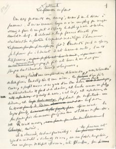 (1868-1938). Manuscrit autographe signé, L’Éternelle Enfant, 11 octobre 1925 ; 5 pages in-4 avec ratures et corrections. Hommage à une femme-enfant (le titre primitif fut La Femme enfant), à rapprocher de Trente-six femmes, psychologie féminine (Mercure de France, 1926). « Vous avez quarante ans sonnés, mais je ne le dirai à personne. Je vous ai connue lorsque vous n’en comptiez que vingt et veniez de faire la conquête et d’épouser le septuagénaire et riche Arnold de Sais »... Il l’aperçut pour la première fois à Cauterets, à la descente de son auto, l’une des toutes premières, monumentale et admirable. « Vous aviez l’air d’une complication délicieuse, mais débarrassée de toute gêne. Vous étiez sûre de vous-même. Ces cheveux d’un pâle cuivre, ce profil mince et ces yeux d’un bleu de lac froid, ces délicates touches de fard et de charbon, cette bouche comme un fil et ces oreilles de nacre, ce col long, cette expression de dédain, cette gorge haute qui supportait un buste bref et de longues jambes, affirmaient la plus grande grâce humaine que j’aie vue »… Etc.