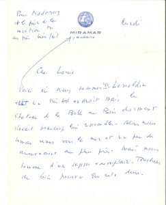 (1898-1979). L.A.S. « Jef », Biarritz lundi [10 juillet 1973], à Louis Nucera à Nice ; 2 pages petit in-4, en-tête Miramar Biarritz, enveloppe. Il a quitté le Larraldia, qui ressemblait au château de la Belle au Bois dormant, pour venir vers la mer : « nous sommes d’une sagesse exemplaire. […] Ma seule activité : prendre des coups de soleil et m’insulter, ensuite, pour ma bêtise – Ah oui, il y a encore les coups de sifflets des surveillants de plage qui trouvent toujours que je vais trop loin. […] Écrire, pas question. Lire : le plus facile, journaux, magazines et comble de l’effort : une série noire. Je me repose vraiment. J’en avais sans doute besoin sur tous les bords »… On joint une L.A.S. de Jacques Perret à Louis Nucera, 5 mai 1980.