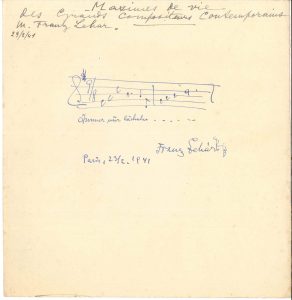 (1870-1948). P.A.S. musicale, 1941 ; sur 1 page in-4.Pour les « Maximes de vie » du journaliste Henri Corbière, il inscrit 2 mesures avec paroles : « Immer nur lächeln… » extrait de son opérette Das Land des Lächelns (Le Pays du sourire), signé et daté : « Paris, 23/2 1941 ».
