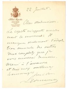 (1858-1919). 5 L.A.S. et 1 L.S., juillet-décembre 1915, à la cantatrice Marthe Chenal ; 9 pages in-8, 4 en-tête de l’Hôtel Majestic à Paris. Paris 22 juillet-2 août, au sujet des répétitions et de l’exécution de l’Hymne à la France créé par Marthe Chenal cet été 1915 à Paris : préparation des copies et arrangement des couplets, orchestration, répétition au piano puis à l’orchestre, etc. « C’est Choudens qui édite le morceau qui porte en tête votre nom »... Viareggio 30 décembre 1915, il envoie ses voeux « pour que surgisse bientôt l’aube de la Victoire pour nos chères patries ! »... On joint un article dactyl. sur Marthe Chenal.