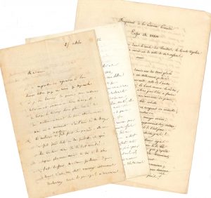 63 L.A.S. et 4 manuscrits autographes signés. Jean-Jacques Ampère (3 longues lettres), Auguste Barbier (1876, à Louise Bertin sur ses Nouvelles Glanes), Jules Barbier (sur Faust), Francis Charmes (5, et un ms Influence de Cicéron), Gabriel Charmes (importante correspondance de 47 l., principalement avec G. Patinot, sur ses voyages en Afrique et ses articles, et un ms Les attraits de la littérature), Antoni Deschamps (ms Fragment de la Divine Comédie), Émile Deschamps (ms La Reine Mab), Émile Deschanel (1877, sur son fils), Paul Déroulède, Paul de Rémusat (2), Rodolphe Salis (Le Chat Noir, 1887), Eugène Scribe (1839, pour la mémoire d’Adolphe Nourrit).