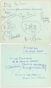 (1890-1976). 2 P.S., 1959-1964 ; sur 4 pages oblong in-12 sur papier vert d’eau. Feuillets d’un album amicorum. 24 octobre 1959. Une quinzaine de signatures, dont celles de James Jones, Bernard Pfriem et Maxime Pfriem (de La Falaise), Adrian Pryce-Jones, Claude et Hélène Hersaint, William N. Copley (amusant petit dessin signé CPLY), Maurice Henry (avec son profil dessiné), Juliet Man Ray, et Man Ray (en calligramme dans le dessin d’un trèfle à quatre feuilles)... 1 rue Léopold Robert, 14 avril 1964. Une dizaine de signatures, avec quelques inscriptions, la première par Marie-Laure de Noailles : « Je suis l’historienne de la crème au chocolat » – suivie de « Lu et approuvé Man Ray »... On relève aussi Claude et Françoise Hersaint, etc.