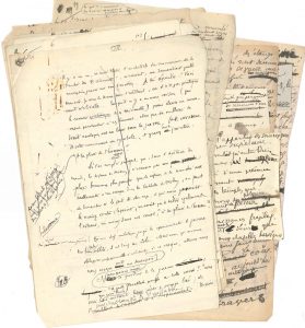 (1895-1972). Manuscrit autographe, [vers 1921-1924] ; 14 pages in-8. Brouillons pour une première version du Chant funèbre pour les morts de Verdun, très différente du texte définitif publié chez Grasset en 1924. Ces brouillons de premier jet, la plupart au dos de papier de la Compagnie d’Assurances générales Maritimes ou de fragments du tapuscrit du Dialogue avec Gérard, sont abondamment raturés et corrigés, avec des béquets, et en grande partie biffés après réécriture, ou après avoir été écartés ; paginés 21[1]-3, 5-8, 19-20, 29-33, ils se rattachent à un chapitre III. Nous en citons le début : « Il y a un an, M. André Ventre, l’architecte du monument de la Tranchée des Baïonnettes, m’écrivait, me demandait quelle inscription graver sur son fronton. Je lui répondis : “Voici mon avis. […] Puisqu’il n’y a aucune raison (que le caractère picturesque de ces baïonnettes pour élever un monument particulier à ces hommes, alors que des milliers de traits analogues ont eu lieu dans la guerre, faites carrément de votre monument un symbole, et gravez sur le fronton : “À la gloire de l’homme” »...