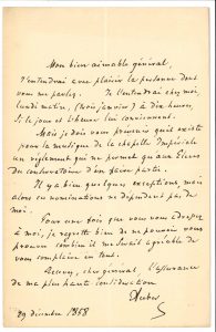 30 lettres, la plupart L.A.S. Daniel-Esprit Auber (1858), Édouard Colonne (4 à Émile Pereire, et 2 cartes), Fromental Halévy (à A. de Beauchesne, 1850), Victor Massé (2, une à J. Barbier pour le livret d’Une nuit de Cléopâtre, 1874), Charles Nuitter (8), Adelina Patti (4), Pablo de Sarasate, Pauline Viardot (4), Jean-Baptiste Weckerlin (5)