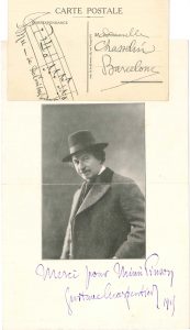 Lettres ou pièces, la plupart L.A.S.Rose Caron (4), Gustave Charpentier (2 portraits dédicacés, un avec musique), Antoine de Choudens (12 à J.L. Heugel, 1862-1868, et doc. joints), Edmond Duponchel (au marquis de Las Marismas, sur la gestion de l’Opéra, 1836), Pierre Lalo (2, et ms a.s. d’article sur Tarass Boulba de Marcel Samuel-Rousseau), Paul Milliet (à P. Loti), Raoul Pugno (4, à Augusta Holmès et H. Heugel).