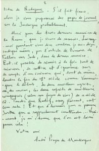 (1909-1991). 2 L.A.S., [1954 ?] et 1960, [à Marcel Thiébaut, directeur de la Revue de Paris] ; 3 pages in-8. 10 novembre [1954 ?]. Il voudrait donner un texte à la Revue de Paris. « Mais la veine des contes fantastiques se trouve actuellement épuisée », et il propose un fragment de Rodogune ou des pages de journal sur la Sardaigne. Il est indigné par l’article de Bernard de Fallois sur Sade : « Est-il possible de réunir à la fois tant de niaiseries, de sottise et d’ignorance sur le compte d’un écrivain qui, tout de même, domine la fin du 18e siècle comme Vauvenargues le début. Les deux meilleurs esprits, du moins, les deux esprits de meilleure compagnie (selon ma façon de voir) de ce siècle là. Tandis que Restif, assez plaisant, est bien sale ! Et que d’honneur pour ce pauvre Sartre que ce rapprochement inattendu »... 8.I.1960, il donne ses instructions pour la publication de La Nuit de Tehuantepec.