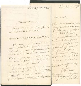 (1823-1892). 7 L.A.S., Sèvres et Paris 1864-1892 ; 10 pages formats divers, une adresse (2 sur papier deuil). 16 février 1864. Instructions à un imprimeur (planches, etc.) : « je désire vivement pouvoir présenter les 2 premières livraisons à l’Académie vendredi prochain »… 27 septembre 1873, [à M. Rey ?]. Demande de renseignements géographiques pour un article dans le Journal des savants sur la thèse de Maspero sur « Karkemisch, qu’il identifie avec Maboug, opinion qui me paraît tout à fait insoutenable »… 26 novembre 1874. Envoi de placards corrigés…30 avril 1877, [à Oscar de Watteville] : « L’empereur du Brésil m’a exprimé le désir qu’il a de posséder la Mission de Phénicie. Je n’en ai plus un seul exemplaire […] Si le ministre pouvait en accorder un exemplaire à l’empereur, il n’y en aurait sûrement pas de mieux placé »… 8 novembre 1889, à M. Bonnetain. « Ne tirez pas Emma Cosilis sans m’avoir prévenu, car j’ai quelques petites corrections à faire. Où en est l’illustration ? »… [Mai 1892], à Mr Neubauer, bibliothécaire à la Bodléienne, Oxford, pour la correction de ses placards : « Vos corrections doivent toutes être des corrections de fond ; laissez-moi ce qui concerne la forme »… – À Hartwig Derenbourg : « J’ai communiqué à la commission votre proposition sur Ousama. La commission est favorable […]. Mais elle exige la remise préalable du manuscrit intégral, […] le texte devrait être communiqué aux commissaires des croisades, pour voir s’il ne conviendrait pas mieux à cette collection »… On joint une l.a.s. de sa sœur Henriette Renan, Marseille 20 octobre 1860, avant son départ pour l’Orient : « mon frère emporte en Syrie un appareil photographique ; un photographe doit aussi être attaché à sa mission »...