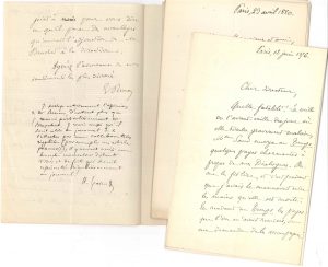 13 L.A.S., 1872-1889, [la plupart au directeur du Journal des Débats Jules Bapst, puis à son successeur et gendre Georges Patinot] ; 19 pages in-8, qqs en-têtes Collège de France. Paris 23 janvier 1872. Vive recommandation de M. Brachet, « qui réunit beaucoup de talent et les plus rares connaissances. M. Brachet pourrait faire, dans l’ordre des sciences historiques, les articles les plus intéressants »… Suit une apostille a.s. d’Hippolyte Taine. 12 juin 1876. George Sand avait envoyé peu avant sa mort des « pages charmantes à propos de mes Dialogues » au Temps, et ce journal lui a demandé quelques lignes sur « l’illustre morte, dont j’avais occupé les derniers moments de pensée calme »… 25 juin 1881. Les Débats « sont une famille. Voilà trente ans que j’y suis entré, et je me rappelle l’accueil que me firent M. Armand Bertin et M. de Sacy comme si c’était hier »… 31 mai 1882. M. Papillon, candidat au Conseil général de Seine-et-Marne, « est un esprit très-libéral, très-éclairé, et représenterait, ce me semble, parfaitement les tendances sagement progressives de vos excellentes populations »… 13 avril 1884. « Jusqu’à ce qu’un grand désarmement s’impose à l’Europe, tout ce qu’on fera en fait d’organisation militaire, sera nous, sera mauvais et contraire au génie de notre pays. Or, c’est là une question qui, comme tant d’autres, dépend de la vie du vieil empereur d’Allemagne »… 28 mars 1887, au sujet d’articles sur le Collège de France, qu’on lui attribue faussement… Rosmapamon 5 juillet 1887. Son Histoire du peuple d’Israël l’absorbe, « mais j’aurai sûrement quelque intermède, et ce sera pour vous »… Perros-Guirec 11 août 1887 : « Israël m’occupe nuit et jour »… 22 juin 1889. Il exprime la vive gratitude de l’Académie des inscriptions et belles-lettres, pour le beau volume du centenaire des Débats : la compagnie « y trouvera le souvenir de plusieurs confrères, qui lui sont restés chers »…