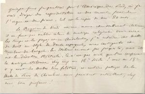 L.A.S., Paris 2 avril 1916, à un cher ami ; 4 pages petit in-4 (petites fentes réparées). Belle lettre au sujet de la musique religieuse italienne et espagnole, et Verdi. De retour d’une tournée de concerts, guéri d’une bronchite, il est en répétitions à l’Opéra-Comique et à l’Opéra, avant de partir dans quinze jours pour l’Amérique du Sud, « où je vais diriger des représentations et des concerts, jouer de l’orgue et du piano. Tel est le repos de mes 80 ans. Le Requiem de Verdi est une œuvre essentiellement italienne […]. La musique religieuse varie avec les temps et les pays ; et en Andalousie, j’ai entendu une Messe de Noël en style de danse espagnol, avec castagnettes et tambour basque. Les Italiens ne vont pas jusque-là mais ils ont la vocation théâtrale ». Ainsi certains passages de la Messe de Sacre de Cherubini paraissent bien profanes !... Il ajoute que s’il a bien correspondu avec Verdi, il n’a jamais eu le plaisir de le connaître personnellement…
