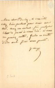 (1804-1876). L.A.S. « George », [Paris 1833 (?)], à François Buloz ; demi-page in-8. « Mon cher Buloz, si vous êtes assez bien portant pour venir me voir, venez un instant. J’ai quelque chose de pressé à vous dire. Si vous ne pouvez sortir, faites en sorte d’être seul. J’irai vous parler »... [Il s’agissait probablement de préparer son prochain départ pour Venise avec Musset.] Correspondance, t. II, p. 448.