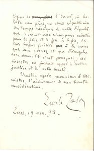 L.A.S., Paris 19 novembre 1899, à Léon Bourgeois, ministre de l’Intérieur ; 2 pages in-8. Recommandation de Léon Besnier pour une sous-préfecture. « M. Léon Besnier a déjà treize ans de service dans l’administration préfectorale. Après avoir été chef de cabinet dans plusieurs préfectures, il est actuellement, depuis cinq ans, conseiller de préfecture de seconde classe à Belfort. Et ses notes excellentes, son intelligence, son zèle le désignent tout naturellement pour le poste qu’il ambitionne. Son grand désir serait d’obtenir une sous-préfecture dans la région de l’Ouest, où habite son père, un vieux républicain des temps héroïques de notre République. Ce serait une récompense méritée pour le père et le fils à la fois, de leur longue fidélité à la cause que vous servez et qui triomphe avec vous »…
