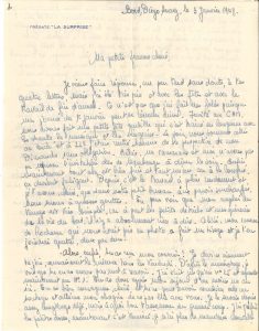 10 L.A.S. de Marcel Million, second maître fourrier, à sa femme Gisèle Million, Diego Suarez, Brest, en mer et Alger 1948 ; 21 pages formats divers, la plupart à en-tête Frégate « La Surprise », 2 enveloppes. Diego Suarez 3 janvier. Invité au CAM, pour le jour de l’An, « nous avons fait une petite fête gentille qui s’est traîné en longueur avec les chants, la musique et les singeries »… Brest 20 juillet. Il ne peut rien faire pour se libérer de la Marine à l’heure actuelle, mais prodigue des encouragements à sa femme, enceinte. « Demain matin nous allons sur coffre en rade-abri en vue de notre appareillage »… Brest 21 juillet. « Nous sommes sur coffre depuis 11 heures dans la rade-abri »… En mer 24 octobre. « Nous arrivons demain matin à 6h45 à Alger […]. J’ai réussi à me faire bien voir à bord par mes chefs, c’est déjà une satisfaction, en attendant celle plus matérielle d’un galon en plus »… Alger 26 octobre, 8 h. Alger est « une très belle grande ville […] vraiment très jolie et très européenne »… 26 octobre 16 h 10. « Demain matin, 8h nous appareillons pour Bizerte […] Nous en repartirons dimanche 31, pour arriver au Pirée le 3 novembre. Nous commencerons la tournée des îles le 5 au soir par La Canée en Crète, Santorin, Naxos, Samos, Chio, Tinos, Syra et le Pirée à nouveau pour le 15. […] Peinture générale avant de nous rendre en Grèce pour mission de représentation avec l’ambassadeur de France »… Diego Suarez 28 décembre, 19 h 30. Chances de promotion… 29 décembre. Information sur la déclaration de revenus, l’envoi d’argent, sa paie… « Je lis Pêcheurs d’Islande. Ce n’est pas un bouquin bien gai pour un marin exilé. […]j’en ai pleuré et à quoi bon verser des larmes, puisque rien ne changera. Pourtant au fond, cela m’a fait du bien »… Etc. On joint 4 l.a.s. à lui adressées par sa femme, 1948, et une à celle-ci d’une cousine, 1949.