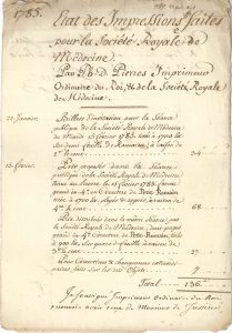 51 P.S. et 1 L.S., 1785. Mémoires acquittés, et reçus, adressés à Antoine-Laurent de Jussieu, trésorier de la Société royale de Médecine : états d’impressions faites pour la Société, fourniture de médailles ou jetons d’or (avec indication des bénéficiaires), états semestriels de distribution de jetons, gratifications ou gages aux suisses et aux garçons de salle, reliure d’ouvrages scientifiques, diligences de Paris, port de paquets, messe dite par les Pères de l’Oratoire… Quelques signatures de Coquereau, vice-directeur, Vicq d’Azyr, secrétaire perpétuel, Dehorne, Mauduyt, etc. On joint 3 remèdes manuscrits, et 2 ff. imprimés à propos des prix de la Société, 1785.