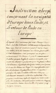 Manuscrit, Instruction abregée, concernant la navigation d’Europe dans l’Inde, et le retour de l’Inde en Europe ; cahier cousu de 79 pages in-fol. en partie réglées (plus qqs ff. vierges). Copie soignée d’une Instruction qui présente des routes maritimes, compte tenu des saisons, du port d’origine et de la destination finale, et qui signale des découvertes, des améliorations des cartes, des erreurs passées, des dangers permanents : traversée du cap de Bonne-Espérance à Pondichéry en passant par le canal de Mozambique, ou par « la grande route » ; traversée des îles de France et de Bourbon en Europe ; voyage de la Chine… Suivent les copies de la Lettre à M. le comte de *** où l’on donne les principaux élemens pour servir a la theorie des vens dans zones temperées…, [par Pierre-Charles Le Monnier], et d’une Dissertation historique sur les vents alisés, et les moussons…, par Edmond Halley, deux études publiées ensemble en une brochure (s.l.n.d., après 1751) : Lettre à propos de l’influence de la lune sur l’atmosphère, fondée sur des réflections sur le vent d’ouest très soutenu au printemps et à l’été de 1751, et Dissertation de « Hallei » (même graphie que dans l’imprimé) sur les vents alisés et les moussons que « l’on éprouve périodiquement à la mer entre les tropiques et aux environs, avec un essai sur la cause Physique » de ces vents…