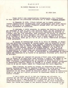 Pièce dactylographiée, 15 juin 1944 ; 3 pages in-4. Copie dactylographiée du « Rapport du Préfet Régional de Limoges », Marc Freund-Valade, sur le massacre d’Oradour, le 10 juin 1944, par un détachement de la Panzerdivision Das Reich de la Waffen-SS : détails sur la destruction de la commune, le mitraillage des hommes, la mort par asphyxie ou par calcination des femmes et enfants enfermés dans l’église… « Toutes ces précisions vous permettront de renouveler votre protestation auprès du Gouvernement du Reich en insistant sur le caractère particulièrement odieux de telles représailles, l’émotion qu’elles ont soulevée et la terreur dans laquelle se trouve actuellement les populations »…
