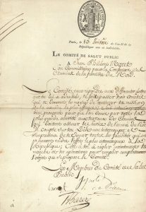 (1767-1794) conventionnel (Aisne), membre du Comité de Salut public, arrêté le 9 thermidor et guillotiné. L.S. cosignée par Bertrand Barère, Lazare Carnot et Claude-Antoine Prieur (de la Côte d’Or), Paris 15 ventose II (5 mars 1794), à Jean-Philibert Maret, « commissaire pour la confection des chemins de la frontière du Nord » ; 1 page in-fol., en-tête et vignette Comité de Salut Public. Le Comité lui fait passer « trois arrêtés qui te donnent les moyens de continuer ta mission de la manière la plus efficace ; son intention est bien prononcée pour que l’on donne par tout la plus grande activité aux travaux des chemins qui doivent assurer le service de l’armée du Nord. Il compte sur ton zèle non interrompu […] C’est à toi à régler maintenant ta marche et tes opérations pour remplir complètement l’objet que se propose le Comité »… On joint une autre P.S. du Comité de Salut Public adressée au même, 16 germinal II (5 avril 1794, 2 p. in-fol. avec vignette et en-tête), signée par Bertrand Barère, Billaud-Varenne, Lazare Carnot et Claude-Antoine Prieur (de la Côte d’Or), copie d’un arrêté concernant le district de Montdidier qui a mis à disposition de l’ingénieur-ordinaire Hébert « du fer provenant des ci-devant églises et autres bâtimens nationaux, pour être employés à la fabrique des outils nécessaires à la réparation de ces routes » ; et sur les « fonds affectés à la réparation des routes », etc…