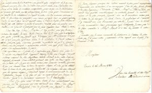 (1734-1810) général et savant piémontais ; l’un des fondateurs de l’Académie des sciences de Turin. L.S. « De Saluces » (le début manque), Turin 16 mars 1783, [à Louis-Bernard Guyton-Morveau] ; 3 pages in-4 (manquent les p. 1-4). Brouille avec Lavoisier. « Il y a deux ans que j’ai envoyé cet ouvrage à Messrs Macquer et Lavoisier, il a été du gout du célèbre autheur du Dictionnaire de Chymie, malgré l’opposition qui pouvoit se trouver entre nos opinions sur quelques points de doctrine, mais je crains très fort de n’avoir pas fait ma cour à Mr Lavoisier que j’estime d’ailleurs beaucoup et qui s’est saisi du mémoire sans qu’il ait réussi à Mr Macquer de pouvoir le racrocher, et sans qu’il ait daigné me faire un mot de réponse, malgré les soins les plus officieux que je me suis donné, pour relever avec éclat les efforts qu’il a fait pour nous donner du nouveau, de même que pour pallier les inexactitudes qui pouvoient lui être échappées, en un mot je l’ai traité comme j’aurai fait Stahl, Macquer, Bergman, &c. [...] Je ne laisse pas de ressentir quelque peine d’avoir pu désobliger ce chymiste, mais je ne pouvois taire des verités qui me paroissoient nécessaires pour arrêter la fougue et la cupidité des nouveaux Physiciens »... Puis il parle des expériences de Guyton, et de la modification que procure l’emploi de l’esprit de vin au lieu de l’eau dans la formation des sels neutres : « le nitre qu’on en retire ressemble assez bien pour la cristallisation à l’acide du sucre [...] pour ce qui est de l’altération qu’éprouve cet acide par le phlogistique je dois vous prier d’examiner ce qui résulte de la cohobation de l’esprit de nitre sur du nouveau mercure, après la formation des précipités »... Il aimerait comprendre « par quelle fatalité un savant aussi distingué que Mr Lavoisier n’a pas été redressé par son expérience même de la résolution de l’acide nitreux en air, puisque après l’énorme quantité du pretendu air qu’il a séparé sa chaux, ou son précipité a néanmoins absorbé une aussi forte dose d’air pour son augmentation de poids »..