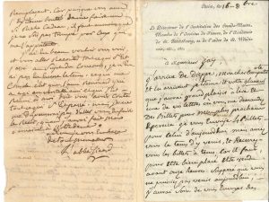 (1742-1822) prêtre, instituteur des sourds-muets. 3 L.A.S., [vers 1811]-1812 et s.d. ; 6 pages et quart in-8 ou in-12, 2 en-têtes L’Instituteur des Sourds-Muets ou Le Directeur de l’Institution des Sourds-Muets…, une adresse. [Vers 1811], à Adélaïde Dufrénoy. Il a cru que le rouleau de romances emporté par mégarde appartenait à sa chère muette, mais d’après ce que dit Laya, chez qui ils dînent ce soir, il suppose qu’elles sont à elle. « Je me fais une veritable fête de dîner avec vous chez votre aimable et cher cousin. […] J’ai vû, ce matin, Mr Renaud de l’École polytechnique qui m’a dit un grand bien de votre charmant fils »… 8 avril 1812, à Antoine Jay. Il a perdu sa lettre annonçant l’arrivée de « la barrique de vin que votre genereuse amitié a absolument exigé que j’acceptasse en pur don », et hier soir, a reçu un avis de livraison recommandant de ne la recevoir « qu’après avoir vérifié le vin »… 16 octobre [1812], au même. Il trouve son Glaneur et envoie quatre billets pour son « plus prochain exercice […] vous m’aves promis de faire connoître ma methode au public. En conséquence je me propose de vous communiquer les petits écrits que j’ai publiés et qui serviront à vous la faire connoître. Je serai même très aise que vous en rendies compte dans le Journal de Paris »…