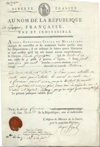 (1759-1794) chef des bureaux du ministère de la Guerre, fidèle partisan de Robespierre, guillotiné le 11 thermidor. P.S., 5 frimaire II (26 novembre 1793) ; 1 page in-fol. en partie impr., petite vignette, sceau de cire rouge du Ministre de la guerre. Laissez-passer pour le gendarme Claude Forquignon de la 29e Division à Paris pour raison de santé.