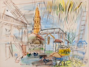 RAOUL DUFY (1877-1953)- La ferme au clocher, 1943.Aquarelle sur papier, signée en bas à gauche.50 x 65 cm.
