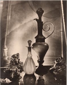 Tirage argentique d'époque signé au recto par Josef Sudek, représentant des flacons en clair obscur.