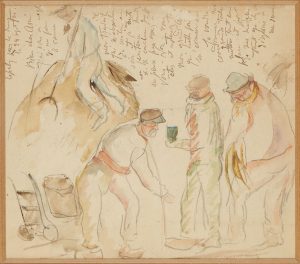 Autograph letter in ink, illustrated by an original watercolor and pencil drawing, representing four farm workers