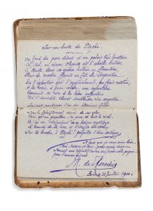 ALBUM AMICORUM by more than 80 writers, artists and personalities, 1899- 1903 ; thick volume of more than 700 pages, including 244 filled pages, in-8 (11 x 17,5 cm - 4,3 x 6,8 inches) ; reused stamped vellum binding of the 16th century.
