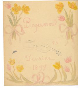 • un projet de programme manuscrit de concert, 25 février 1897, décoré à l'aquarelle par J.M. (JulieManet), où Jeannie Gobillard joue plusieurs pièces au piano, et où interviennent ses cousines Julie Manet au violon et BlanchePontillon au piano ;
