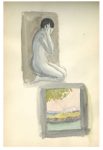 • Sur la même page, femme nue agenouillée de profil, et fenêtre avec paysage marin, aquarelle.