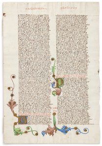 5. [BIBLE]. Feuillet extrait d'une Bible. Fin de 2 Maccabées et début du Nouveau Testament (ici préface de saint Jérôme sur les Evangiles)Deux initiales à l'or bruni sur fonds colorés, prolongements de feuilles d'acanthe colorés ponctués de besants ou disques à l'or bruniEncres brune et rouge pâle, écriture cursive, texte sur deux colonnes Autriche (Salzbourg ou Vienne ?), vers 1475Dimensions : 306 x 202 mm.