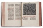 Paris, 1485 ; Troyes, 1485-1495 ; Saint-Omer, 1485), écriture en lettres batardes à l'encre brune texte sur deux colonnes (justification de chaque colonne 80 x 204 mm), réglure à l'encre violette, rubriques en rouge, signés de paragraphe en rouge ou en bleu avec décor filigrane bleu ou rouge, grandes initiales peintes en rouge ou bleu, avec decor filigrane bleu-vert ou rouge (3 lignes de hauteur), plus grandes initiales «puzzle» en tete de livre (4 lignes de hauteur) peintes en bleu et rouge avec décor filigrane bleu-vert et rouge, grande initiale peinte en bleu sur fonds d'or bruni avec décor de feuillages colorés (4 lignes de hauteur, fol.13), 16 grandes enluminures peintes en grisaille et semi-grisaille, la premiere (f. 13) entourée d'une bordure enluminée (feuilles d'acanthe colorees, fruits, fleurs (dont ancolies), feuillages, feuilles de vignes et besants a l'or bruni, le tout sur fonds reserve), armoiries peintes dans la bordure inferieure (f. 13), les miniatures sont inscrites dans des cadres dentelées.