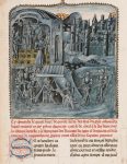 Cet artiste pratique aussi abondamment la semi-grisaille comme dans le présent manuscrit où les touches de couleur viennent rehausser les aplats des nuances grises tirant sur le noir : les dallages des intérieurs, le sang des blessés ou tués dans les scènes de bataille, le feu des incendies et sièges.