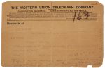 ─ Télégramme (The Western Union Telegraph Company) envoyé par la White Star Line au sénateur J.A. Hughes [dont la fille Catherine était à bod du Titanic], daté New York 15 avril 1912 :